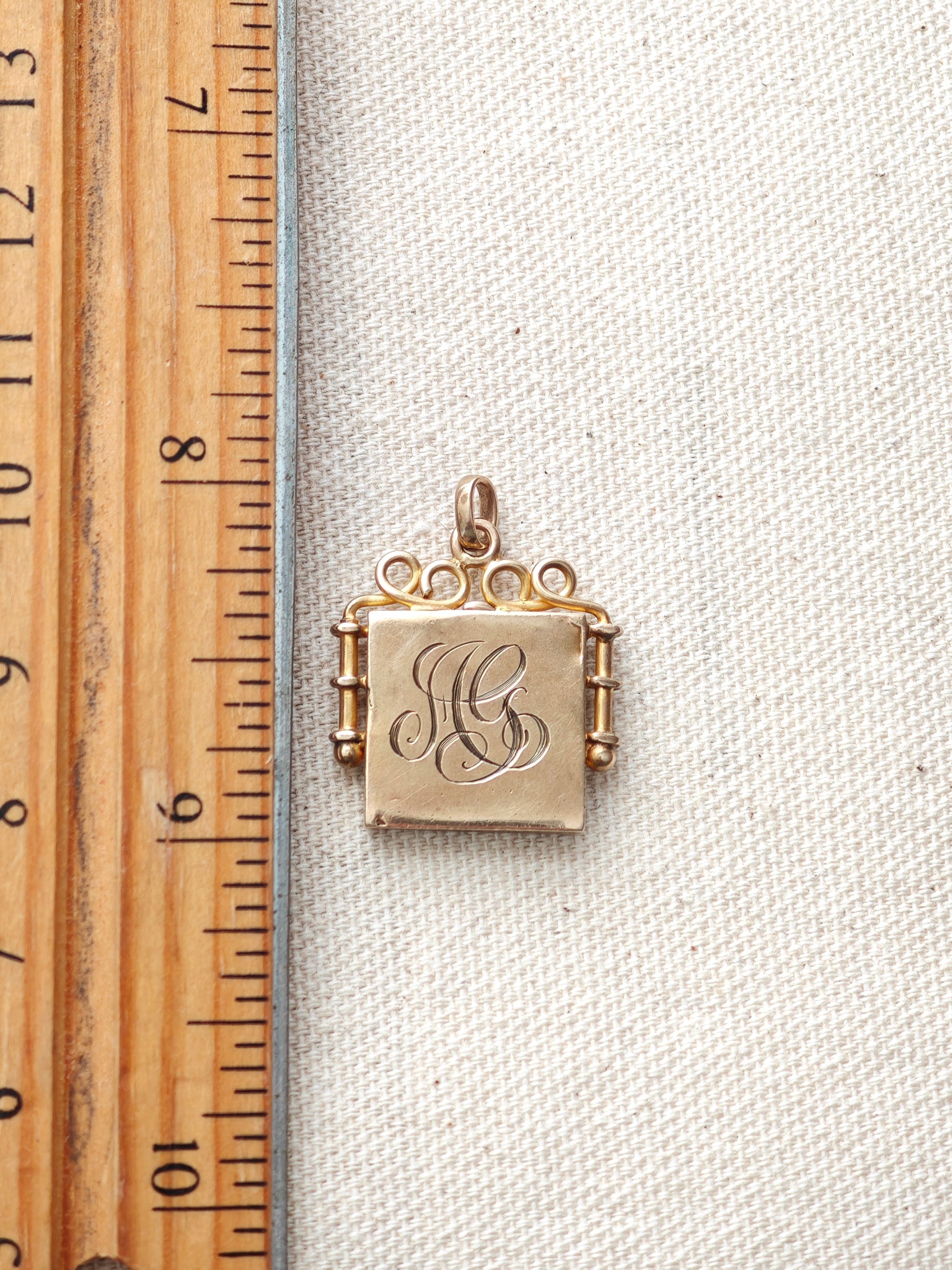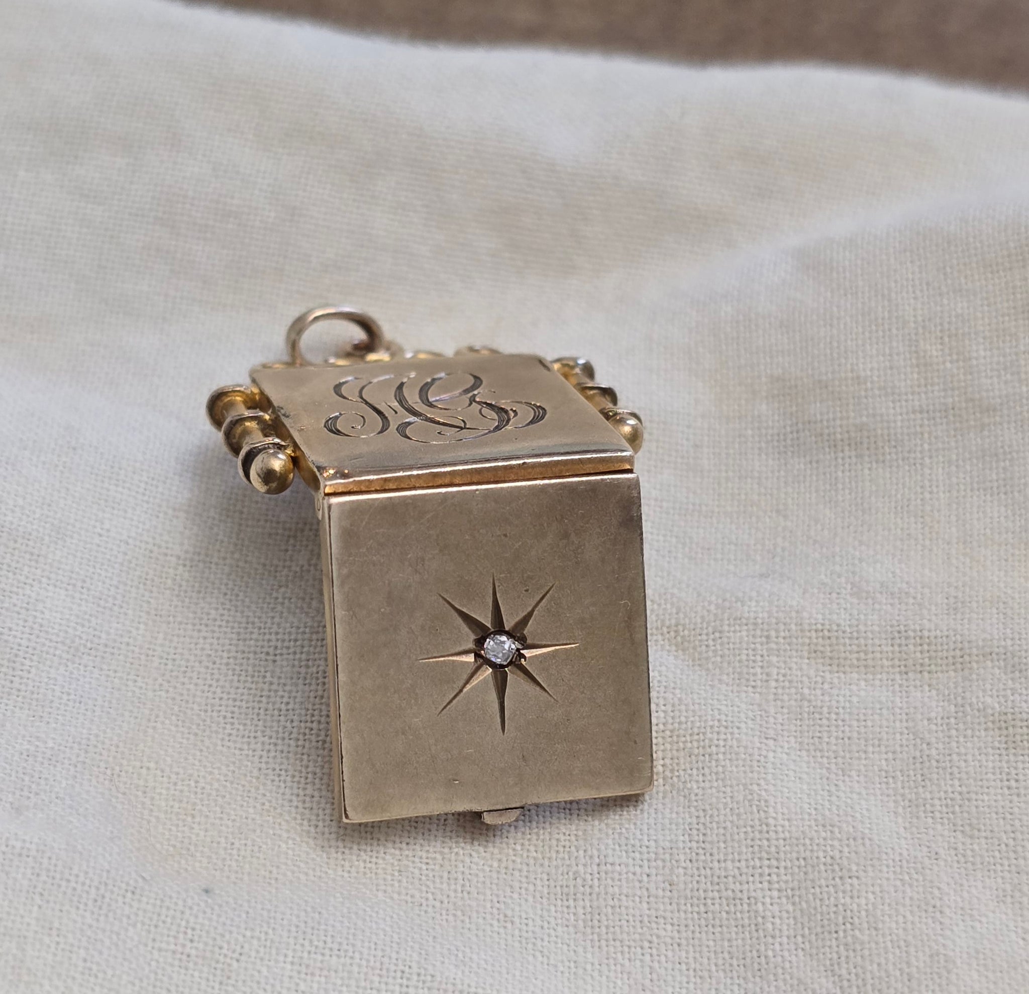 Antique 10K Solid Gold Old Cut Diamond Starburst Square Shape Watch Fob Locket, Monogram AG, Gift for Her