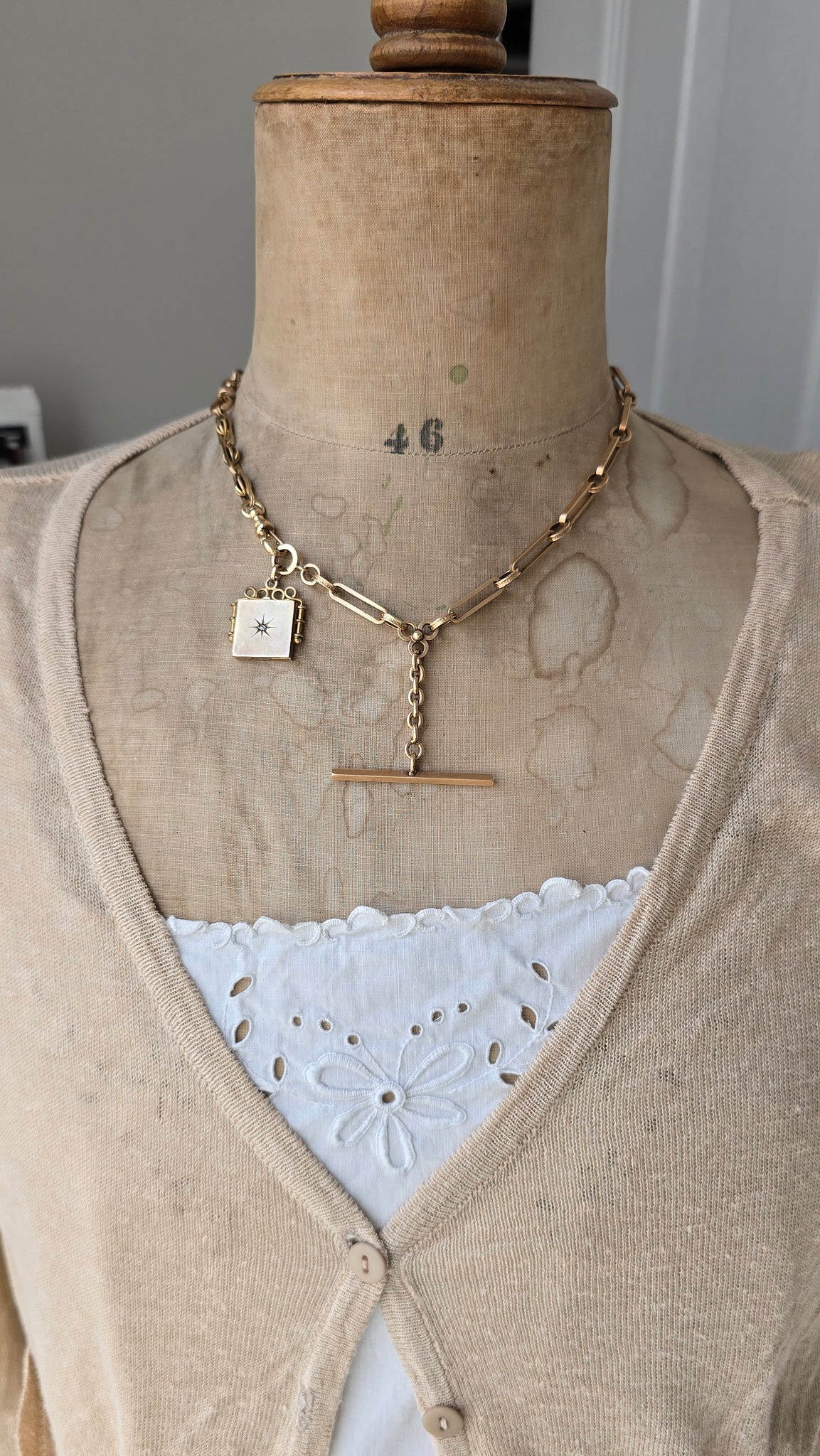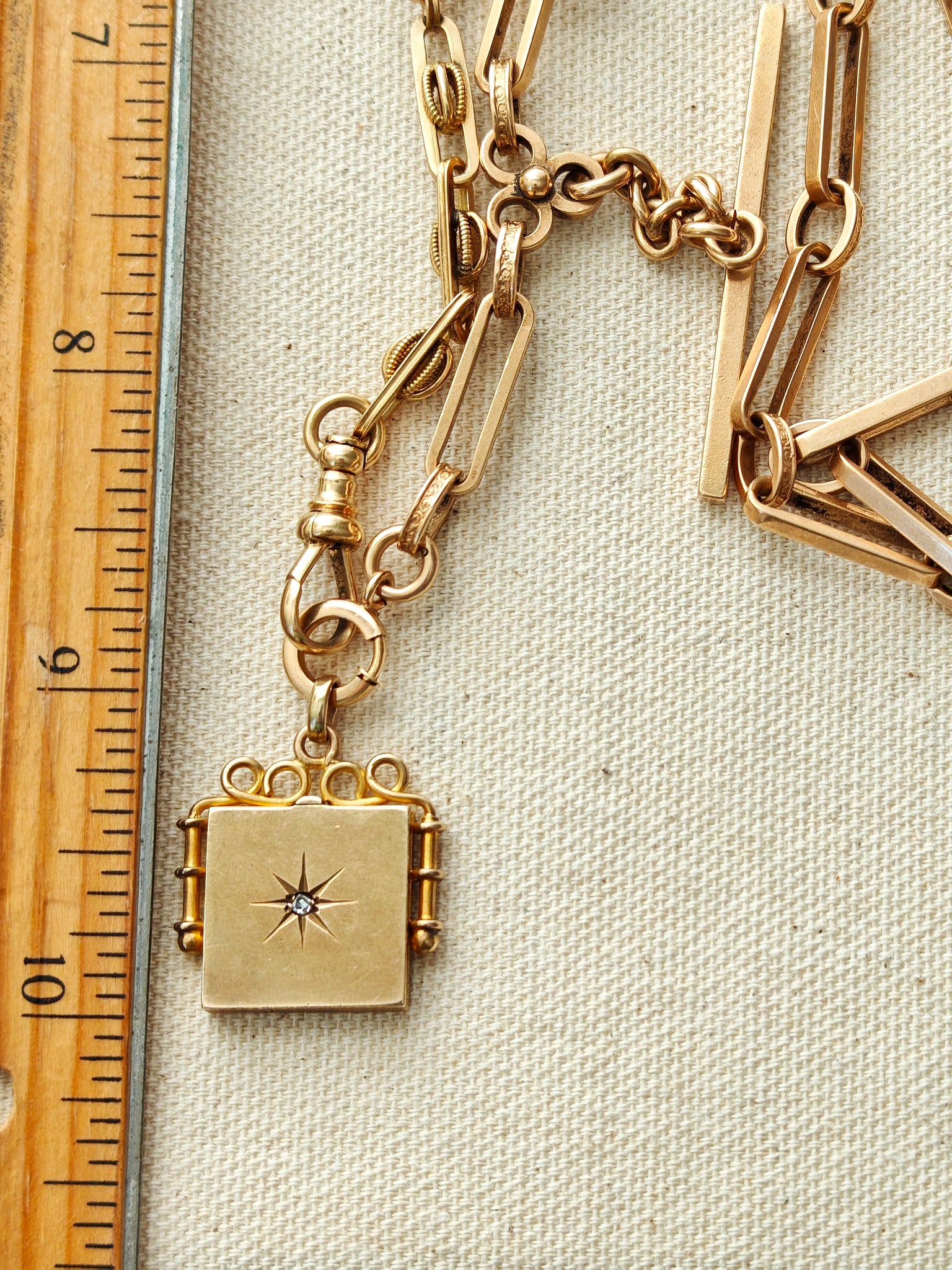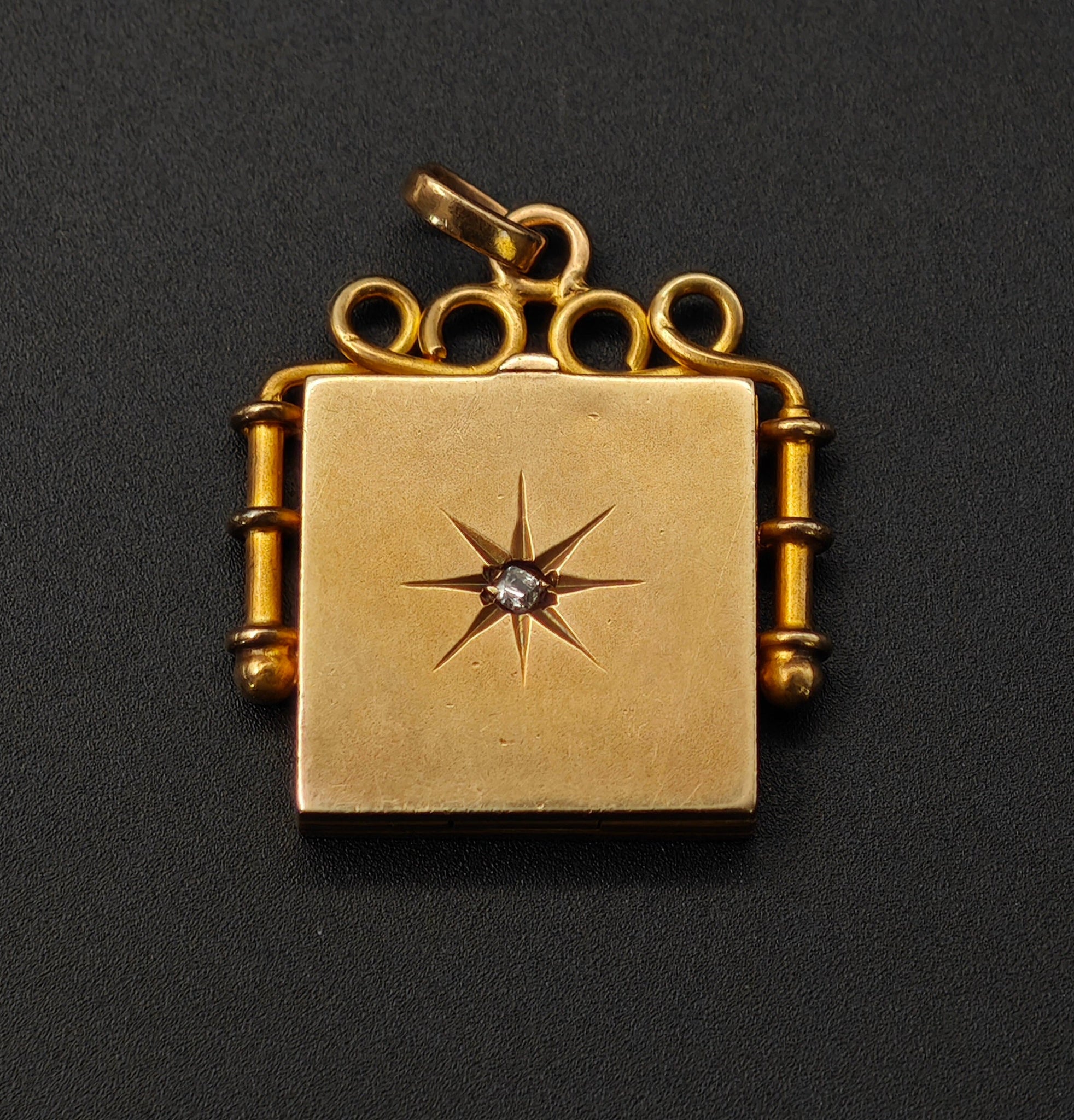 This classic early 1900s late-Victorian 10K solid gold old cut diamond watch fob locket is a must-have piece for any vintage jewelry lover and my all-time favorite. This square-shaped locket features a small but sparkly antique old cut diamond set with a starburst pattern in the center.