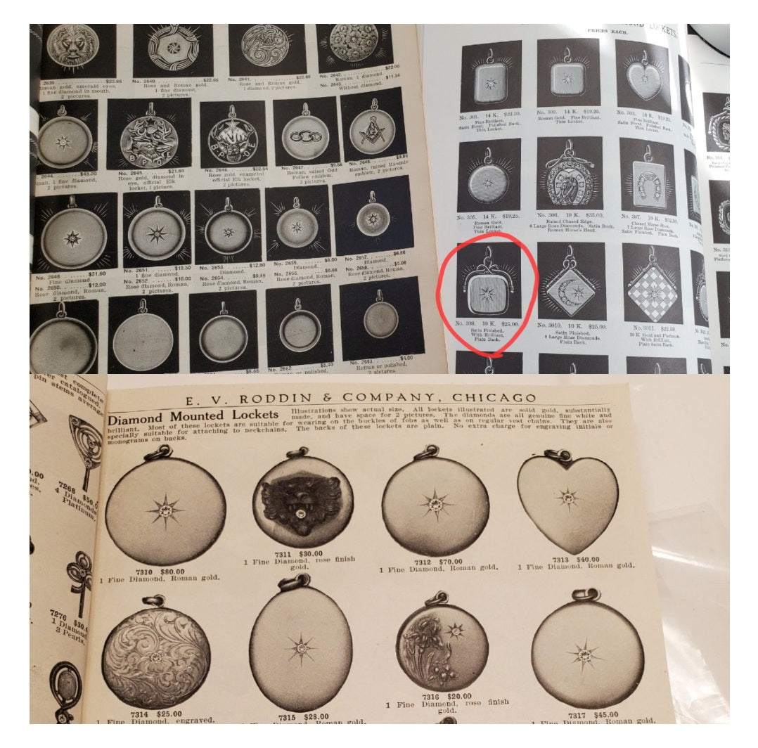 The starburst diamond locket is one of the most popular items in our shop—we’ve sold many over the years. This type of locket appears in the E.V. Roddin & Company 1917 Catalog, CBN Jewelry Catalogue 1910, and Illustrated Jewelry Catalogue 1892. These references serve as our dating evidence and indicate that this classic style was popular from the 1890s to the 1910s. Needless to say, it remains highly sought after by collectors today.