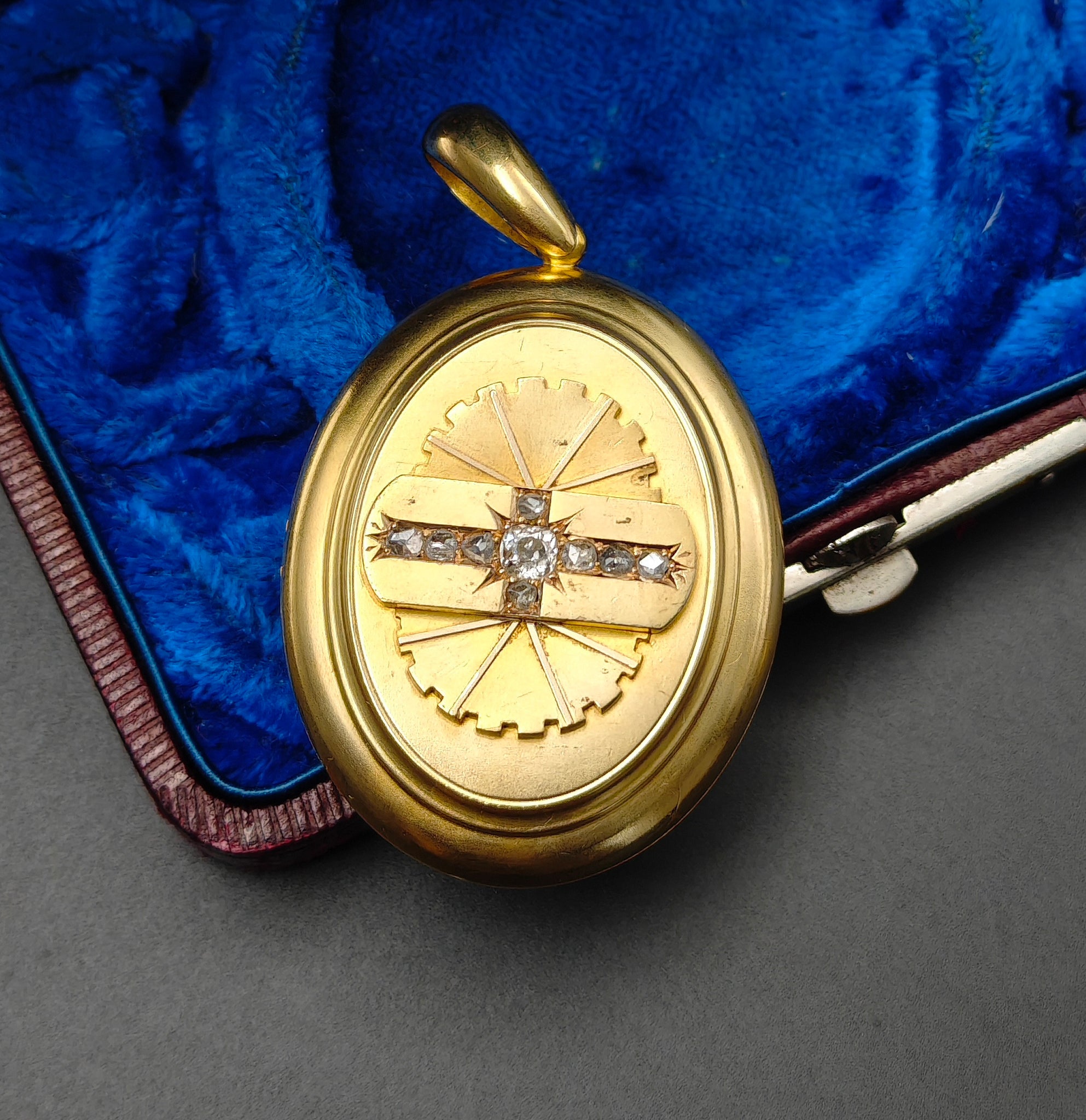 Large Antique Victorian English 15K 15CT Solid Gold Old Cut Diamond Oval Locket, 0.50 CTW, Circa 1880s