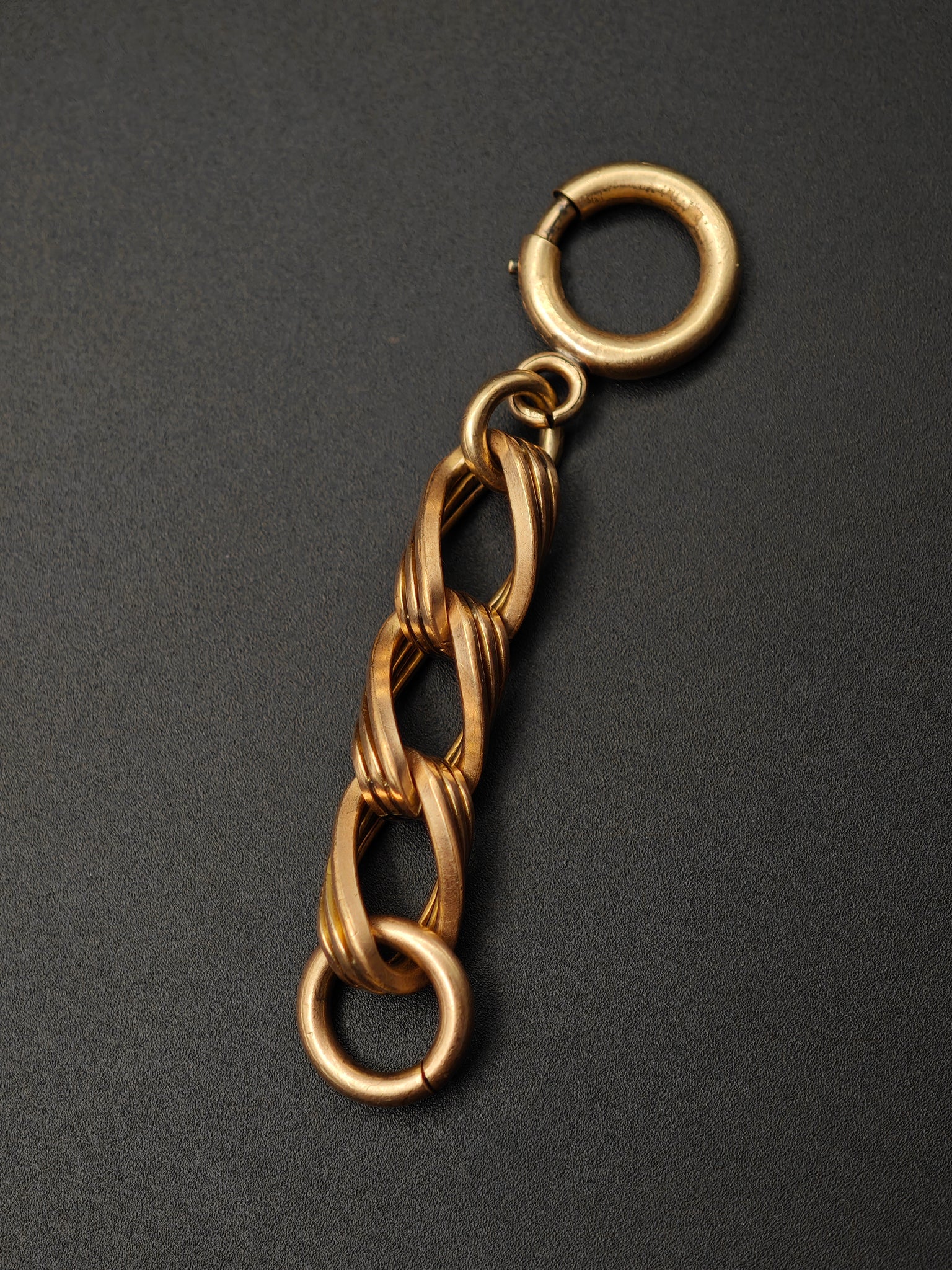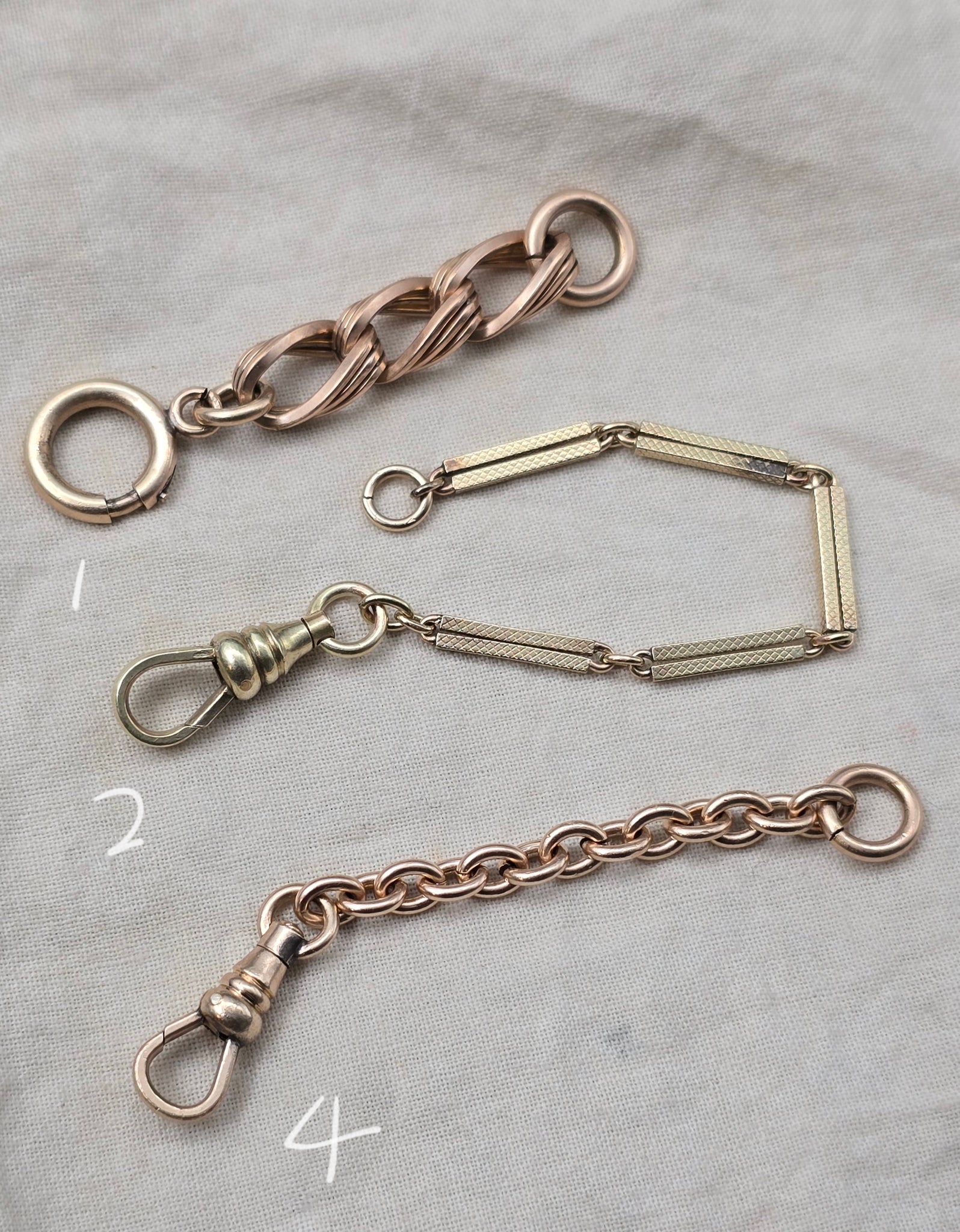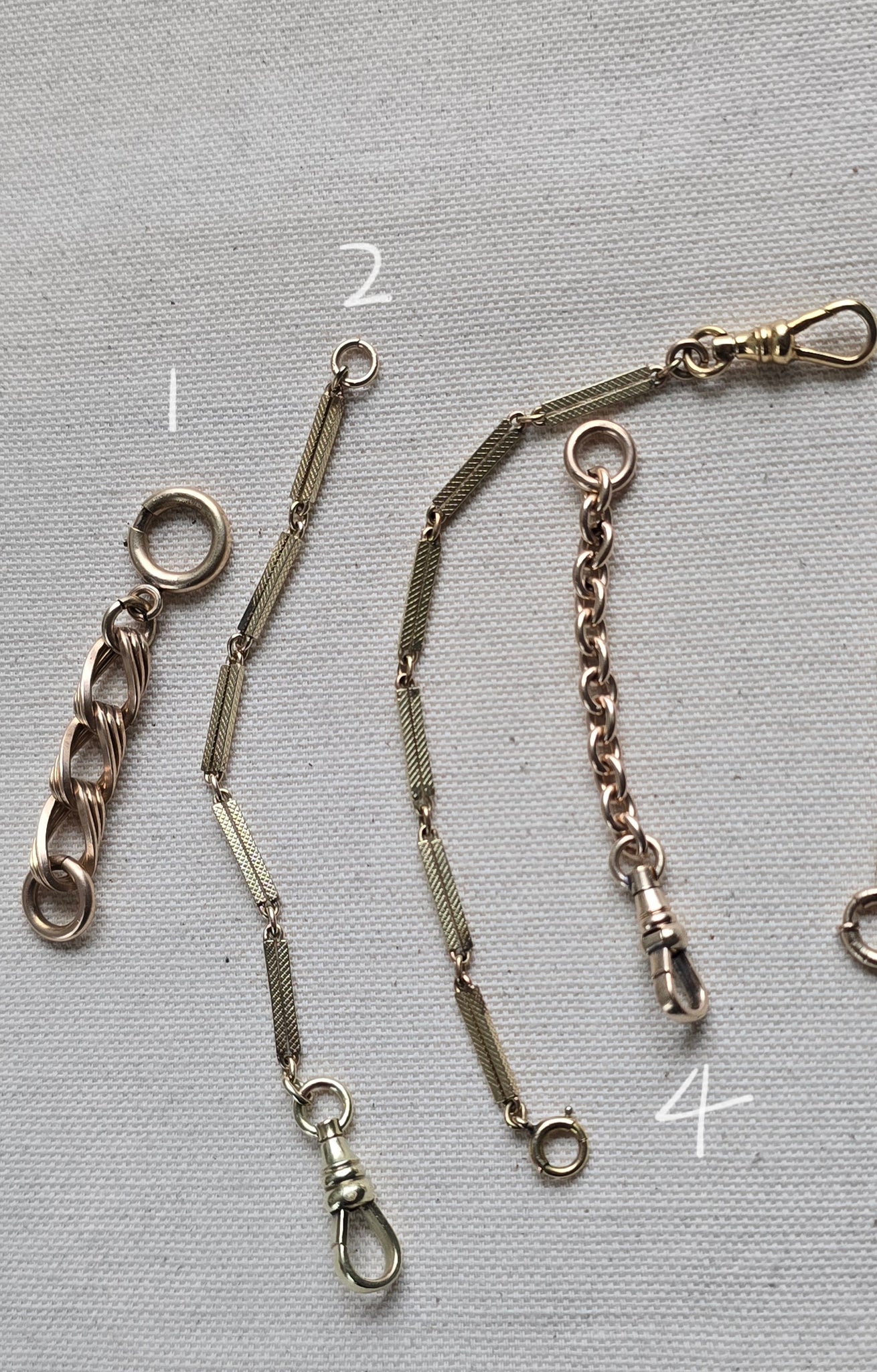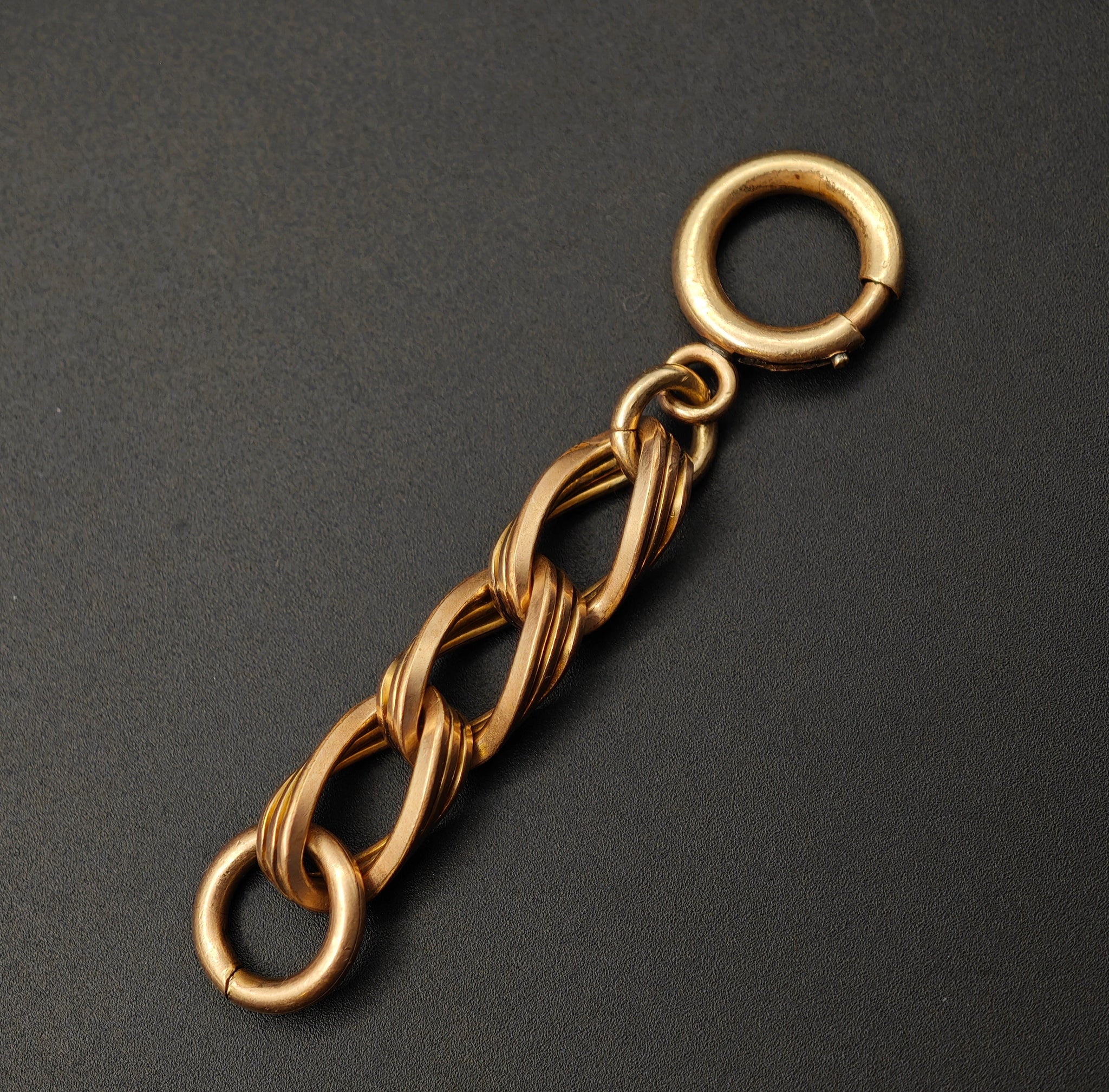 Antique gold-filled/rolled-gold chain extender connected with a medium-large size bolt clasp and includes a short section of original links. This findings was originally watch chain components.