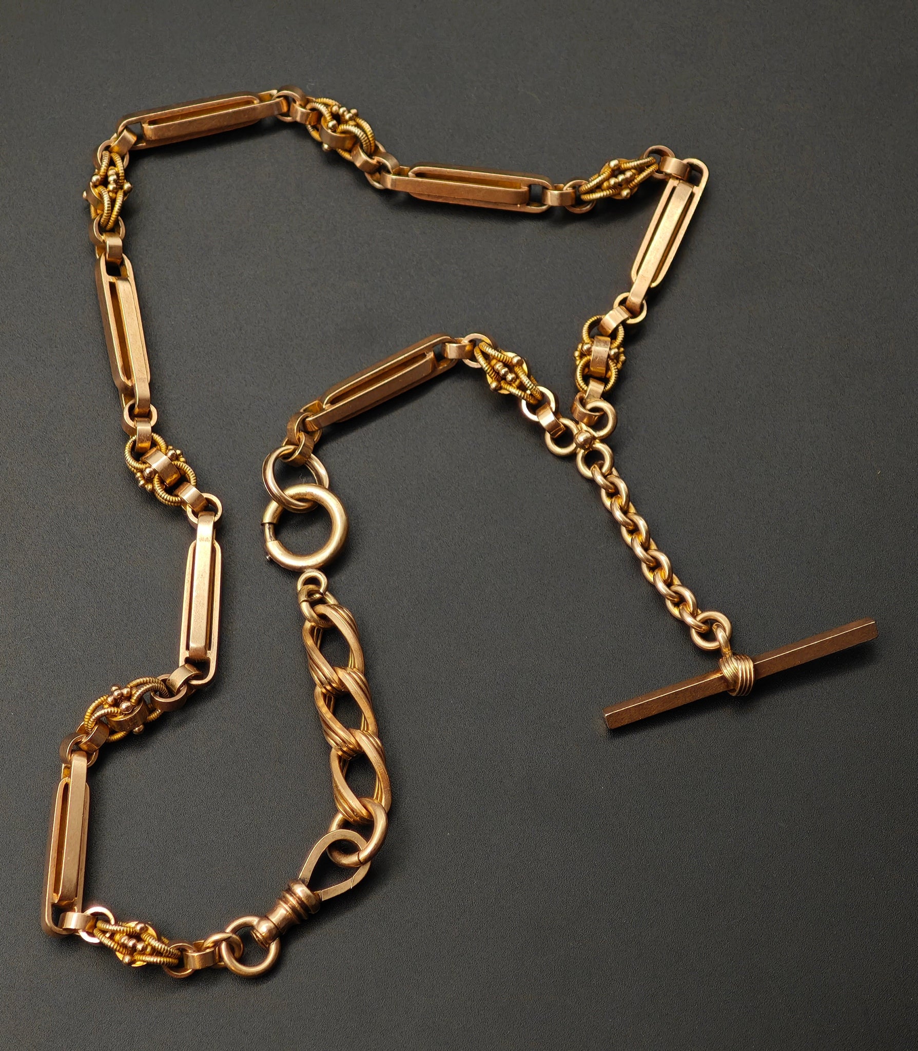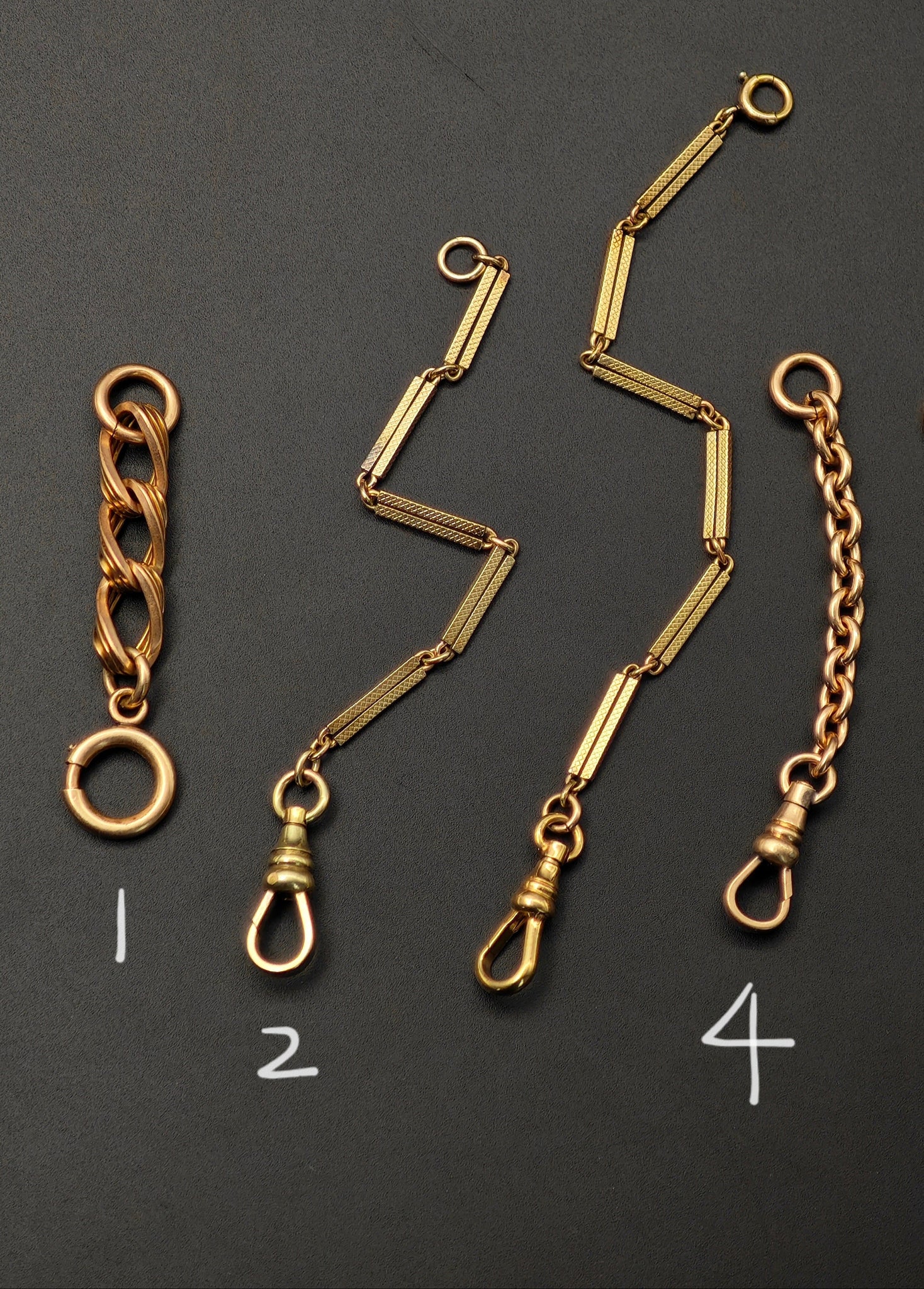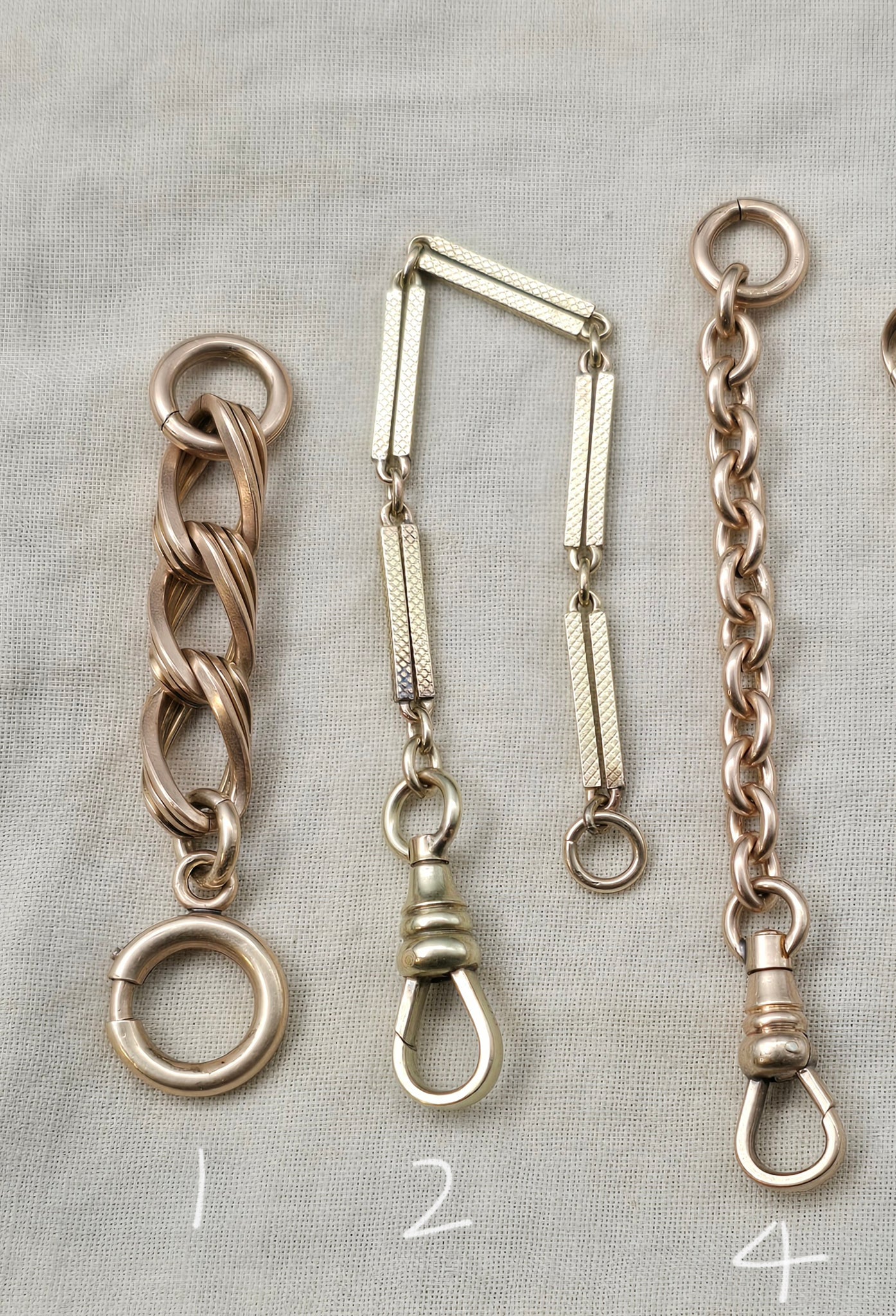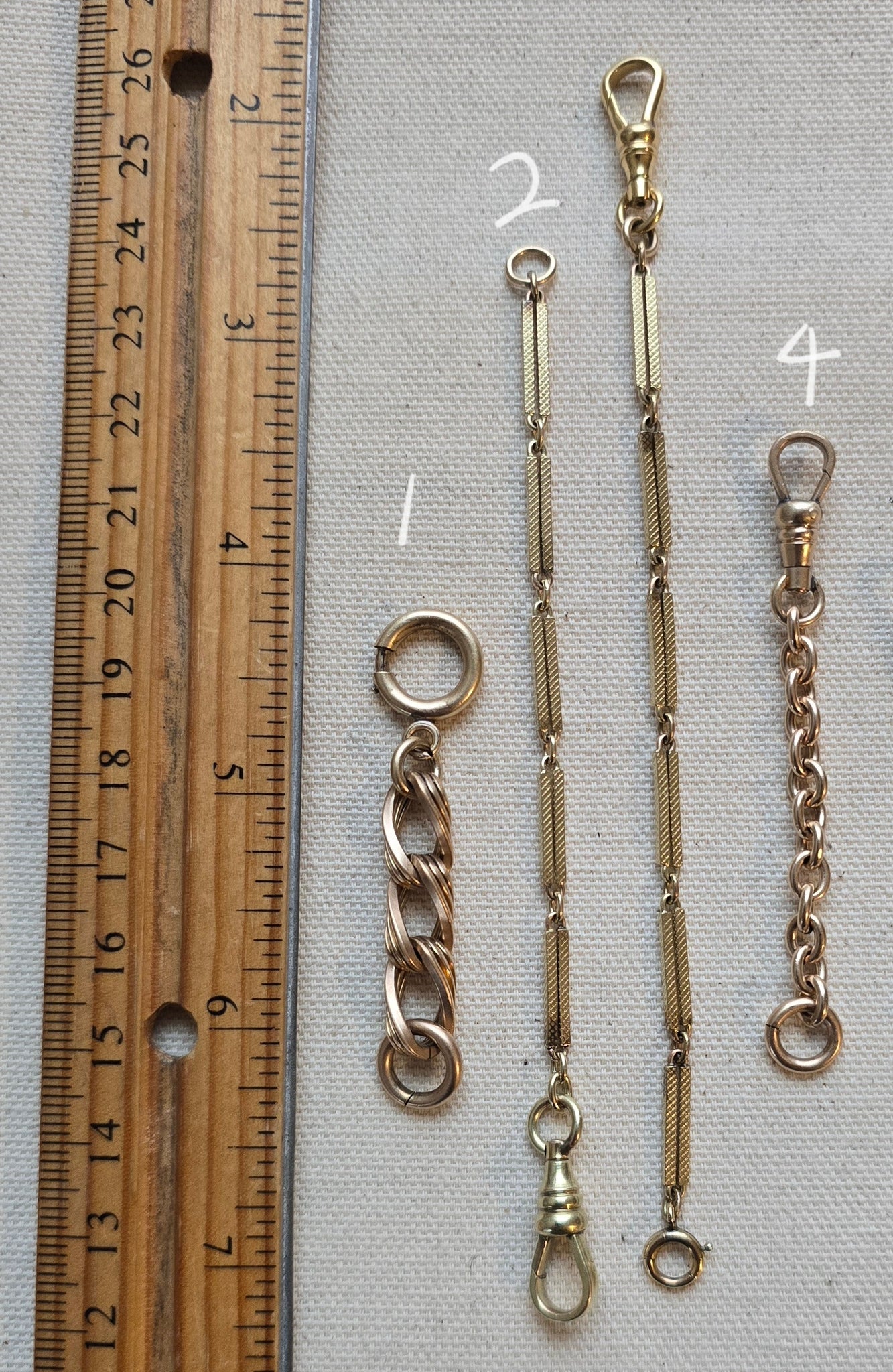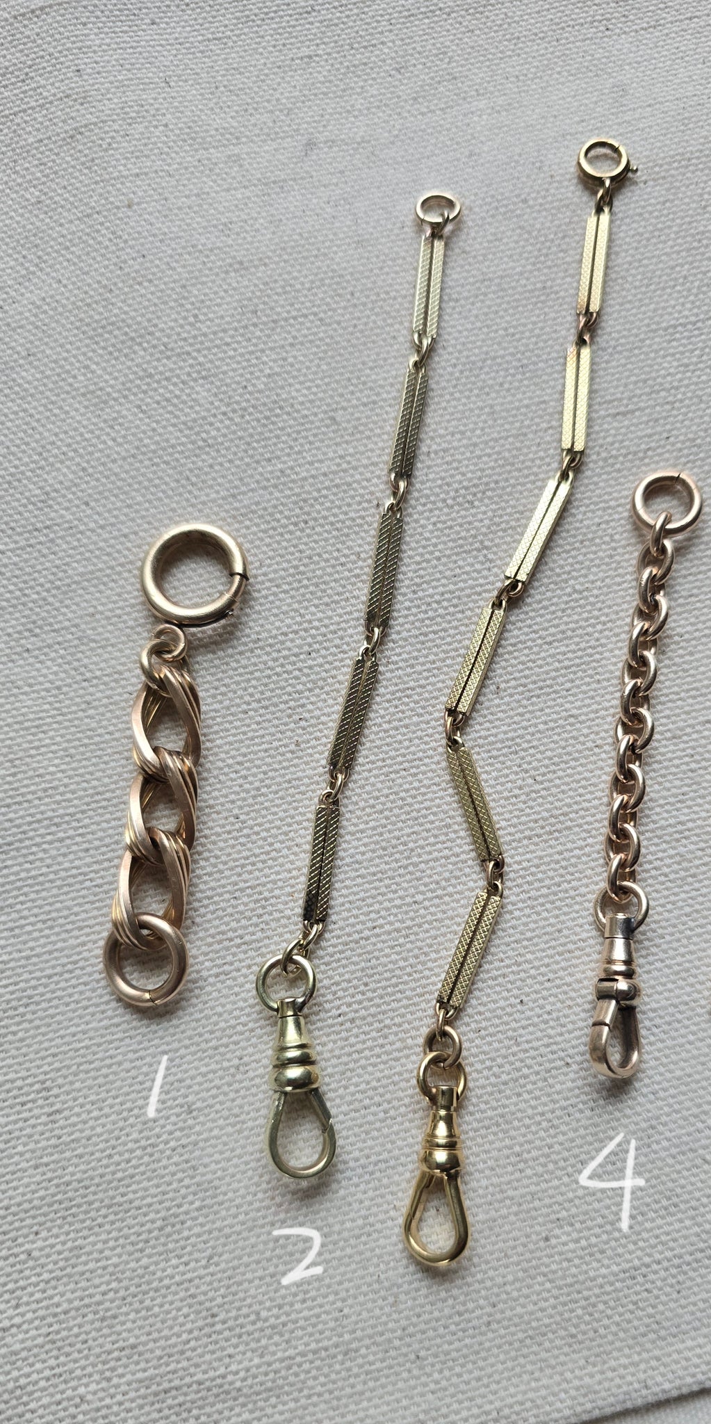 Antique gold-filled/rolled-gold chain extender connected with a medium-large size bolt clasp and includes a short section of original links. This findings was originally watch chain components.