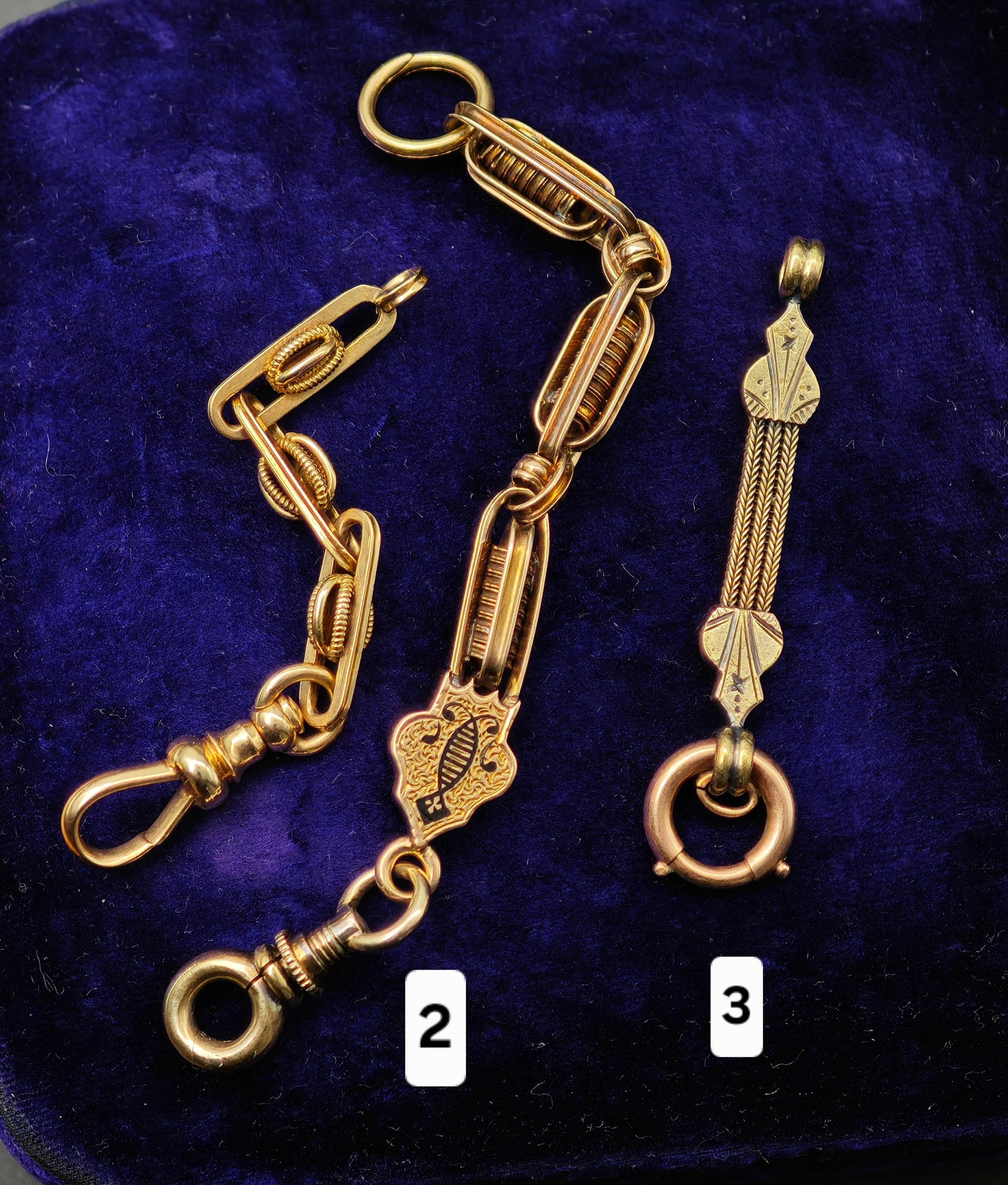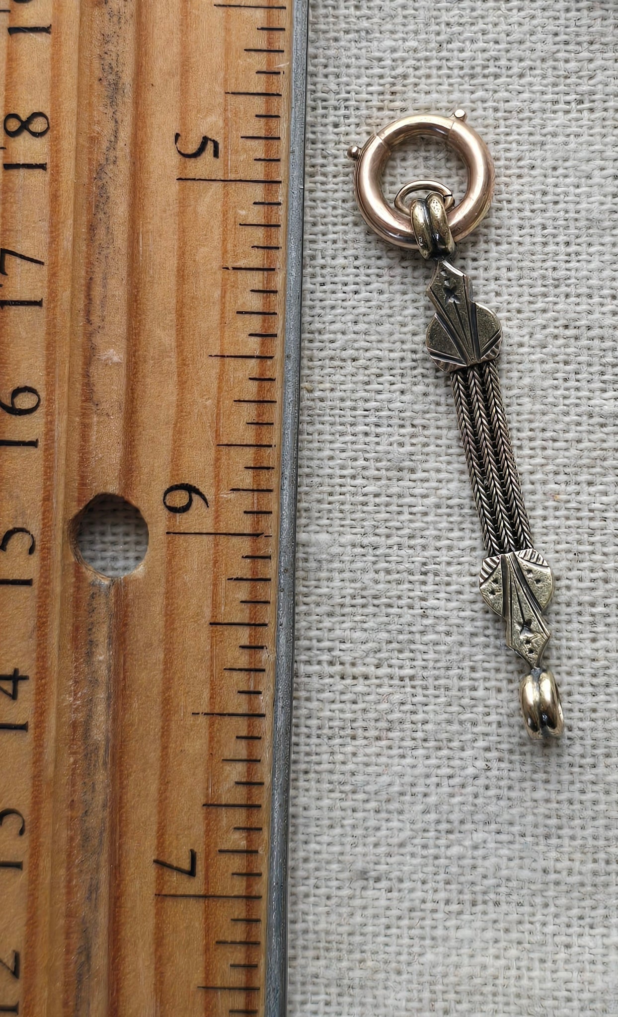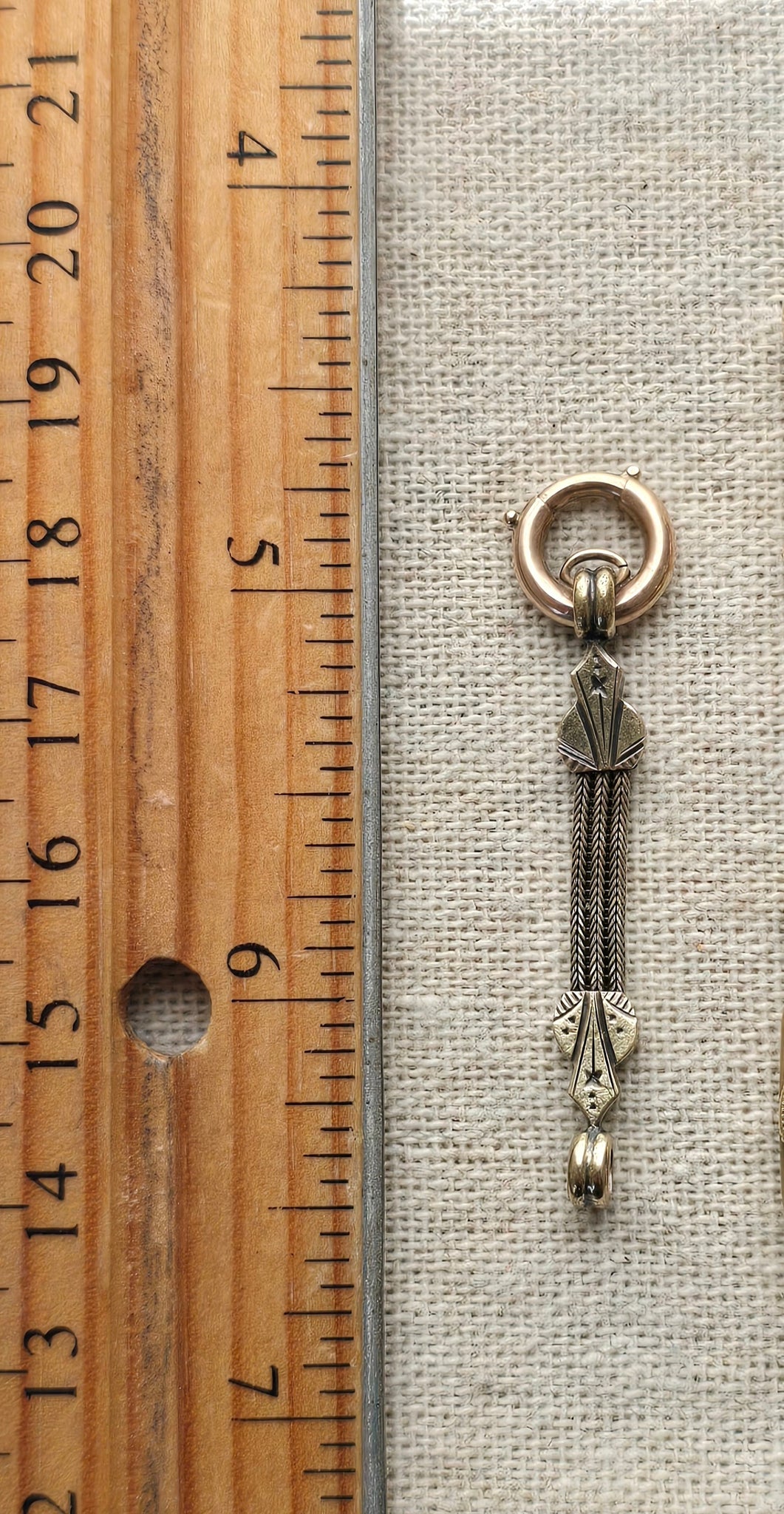 • Composition: 12k link section, 14k split ring, 10k swivel dog clip (with a likely non-gold inner core for structural support — very common in Victorian watch fob findings)