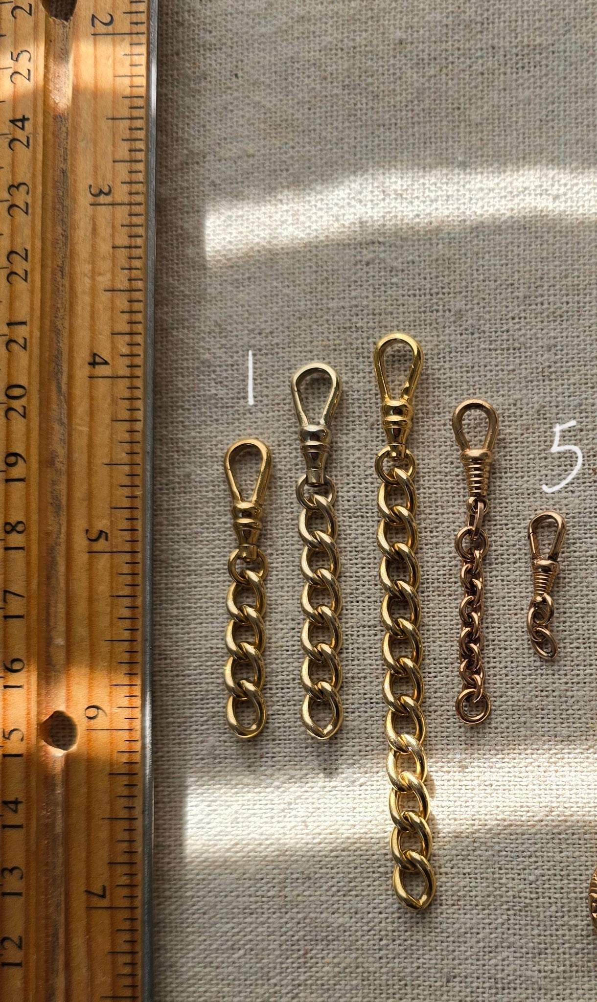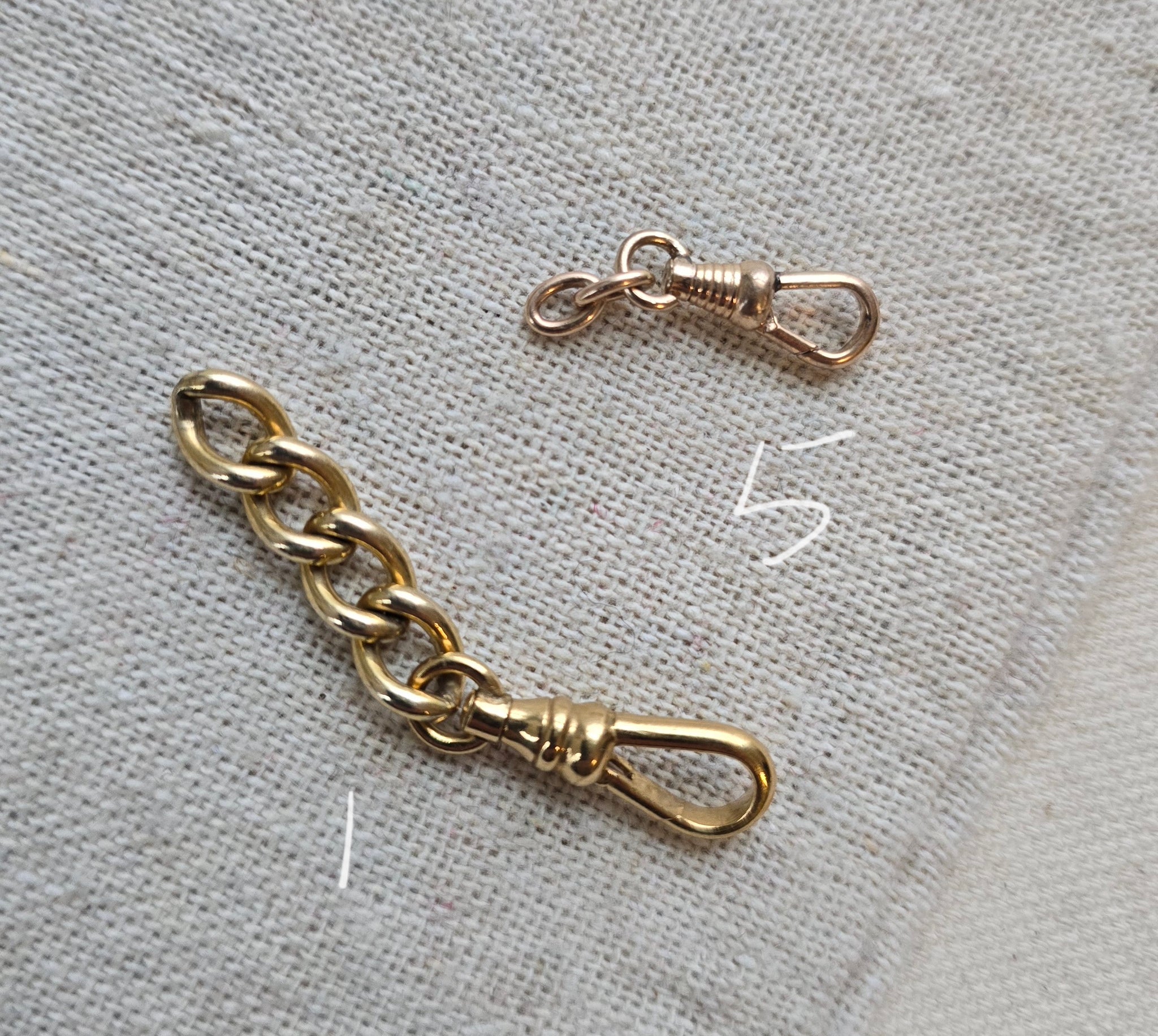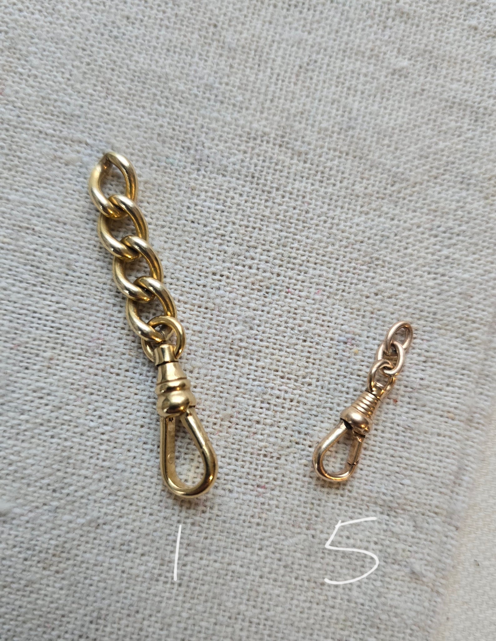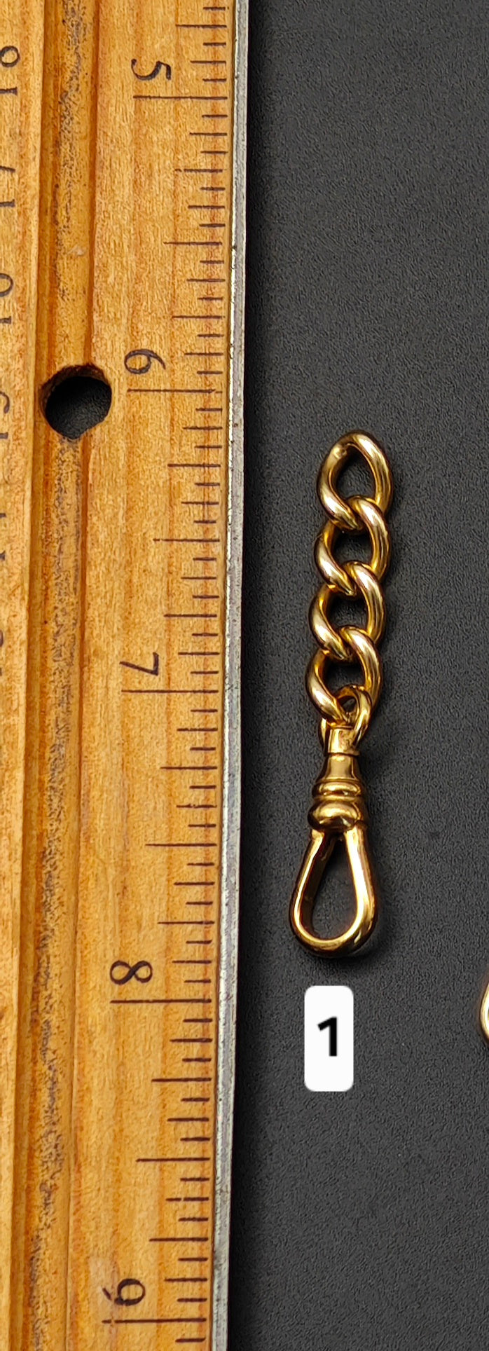 Two antique gold-filled/rolled-gold swivel dog clips, offered individually. Each piece includes a short section of original links. These findings were sourced from a batch of new old stock (NOS) watch chain components, meaning they show minimal prior use despite their age.