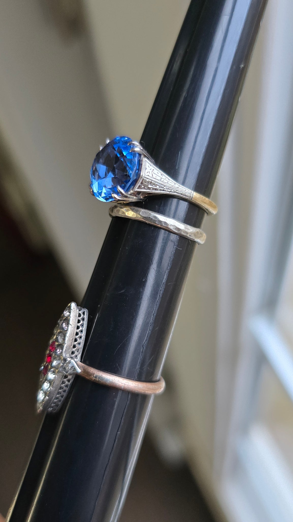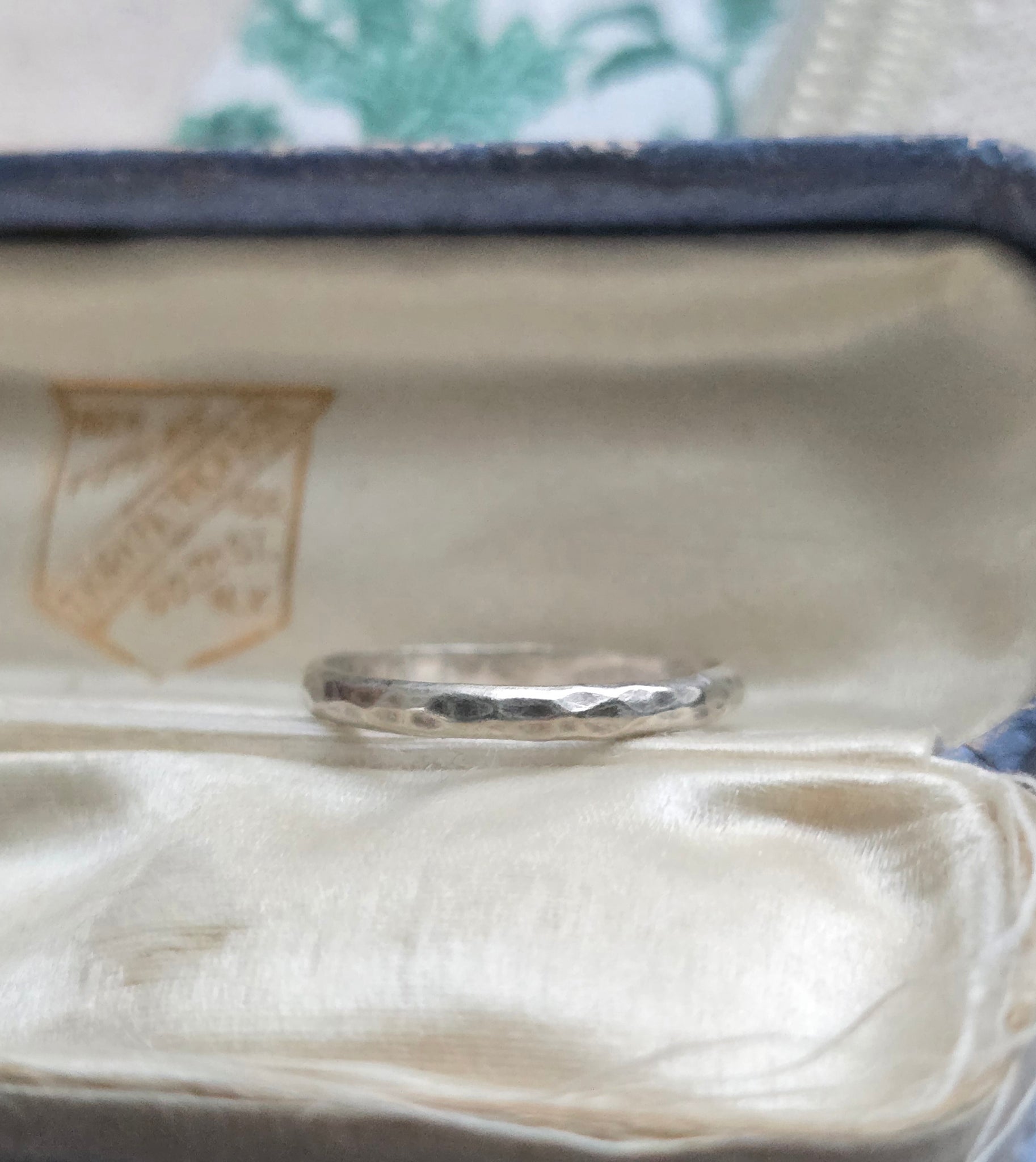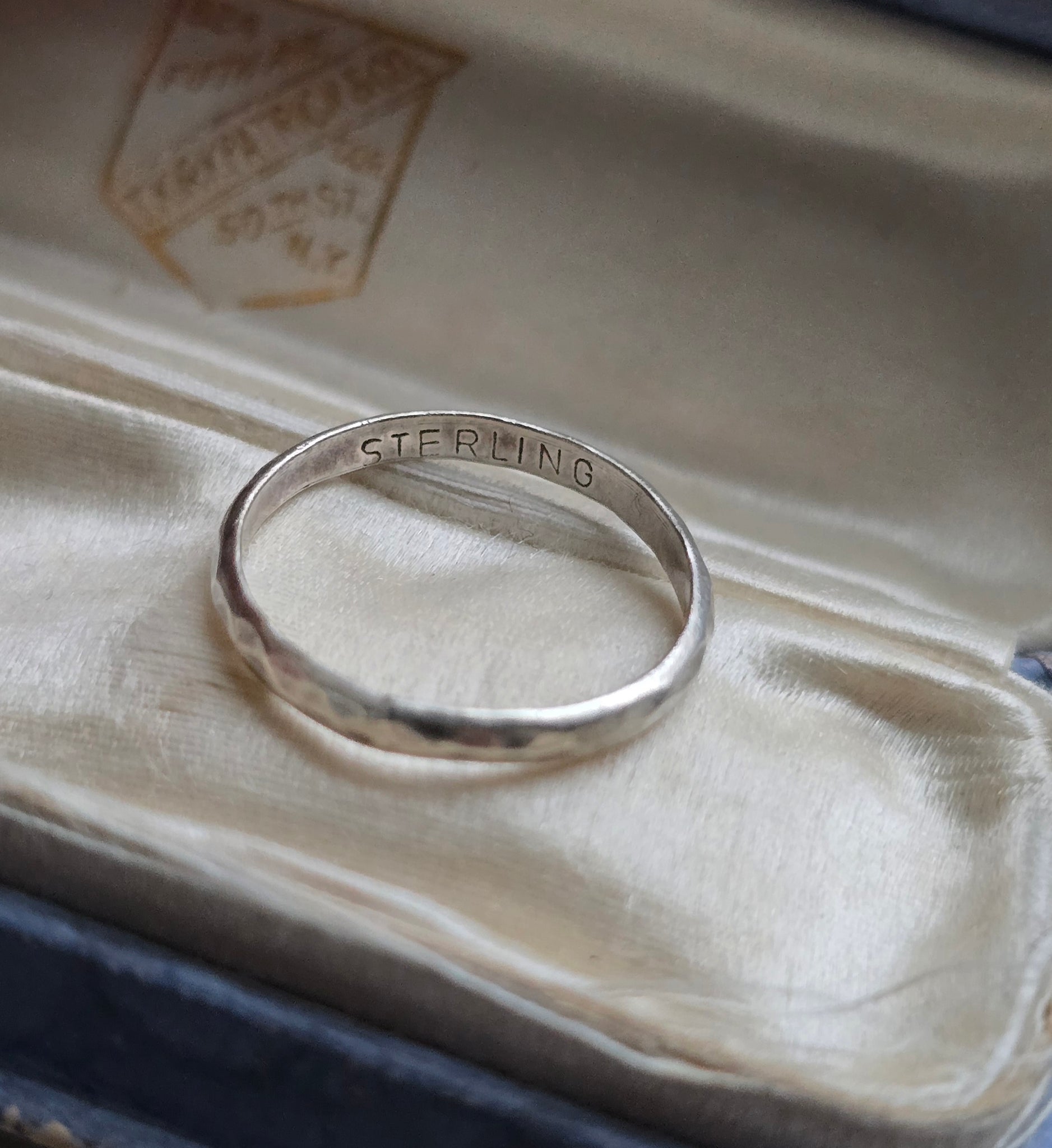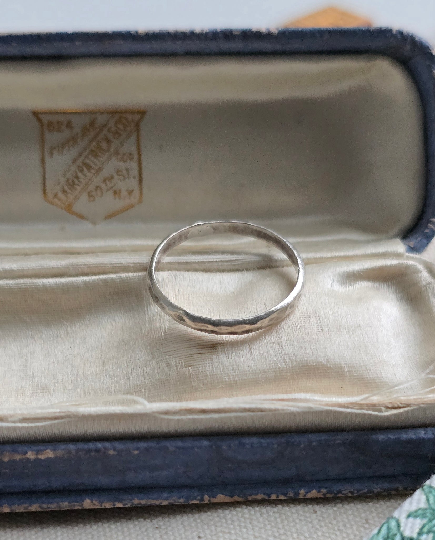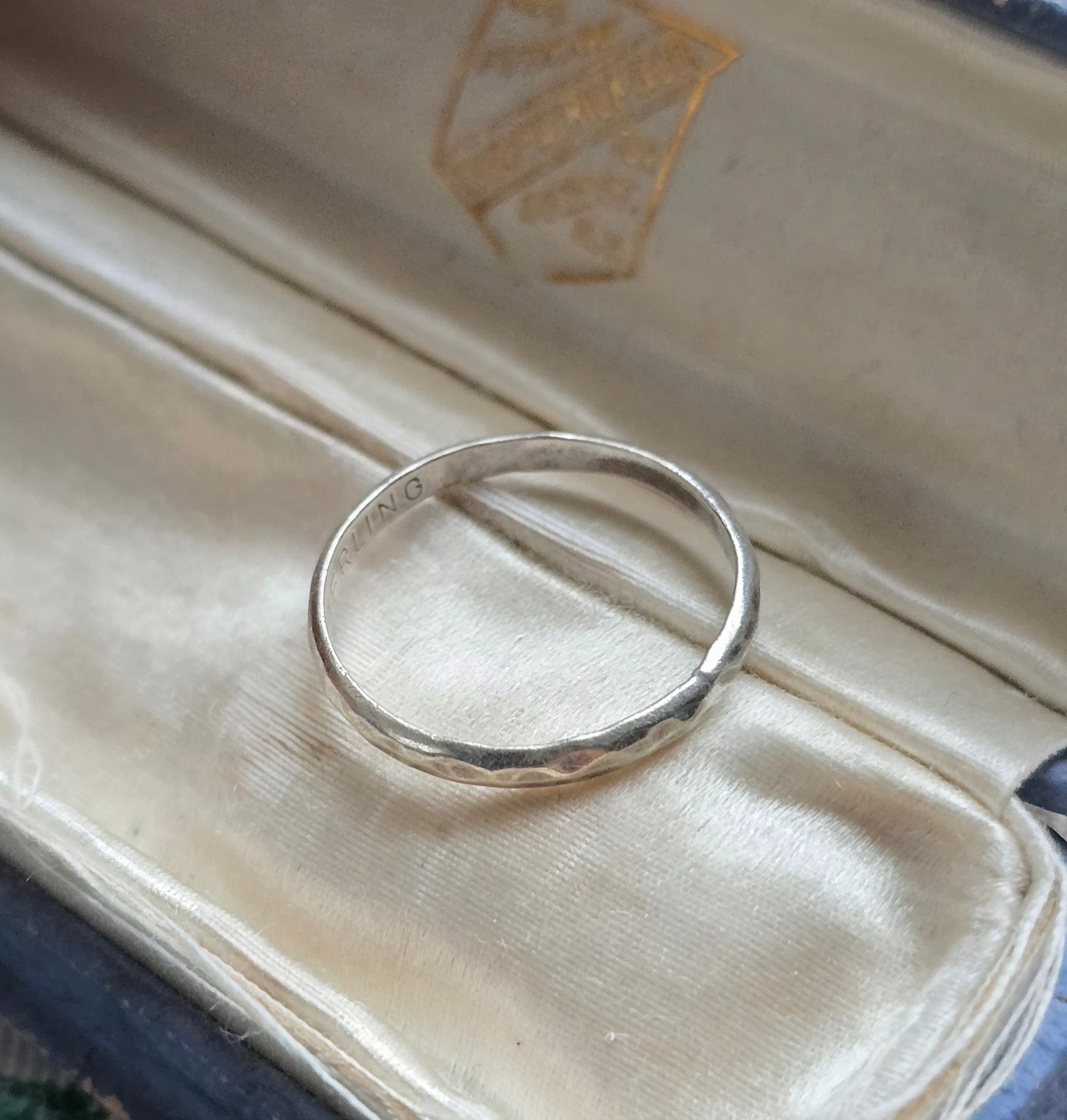This lovely vintage/antique handmade sterling silver band ring features a classic hammered texture and is likely from the Art Deco era (1920s–1930s).